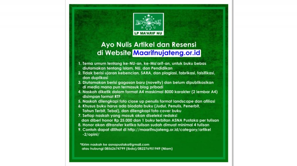 Maarifnujateng.or.id – Tim redaksi website resmi Maarifnujateng.or.id milik LP Ma’arif PWNU Jawa Tengah mengundang bagi guru, kepala madrasah/sekolah, pengurus LP Ma’arif, aktivis NU, dosen dan semua warga NU untuk menyumbangkan artikel populer maupun resensi buku di website tersebut.