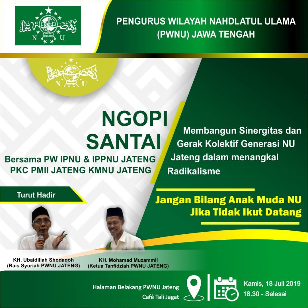Semarang, Maarifnujateng.or.id – Pengurus Wilayah Nahdlatul Ulama (PWNU) Jawa Tengah, bekerjasama dengan IPPNU Jateng, PKC PMII Jateng KMNU Jateng, akan menggelar kegiatan menarik dengan tajuk “Ngopi Santai”, Kamis 18 Juli 2018 nanti malam pukul 18.30 WIB sampai selesai.