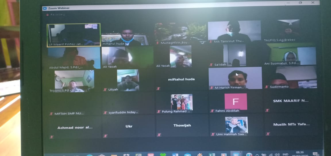 Semarang, Maarifnujateng.or.id – Penguatan kompetensi kepala madrasah/sekolah dengan tema “Mengembangkan Jiwa Kewirausahaan Kepala Madrasah/Sekolah” ini dilaksanakan melalui aplikasi zoom meeting dengan narasumber Drs. Agus mujiono, M.Ed dan M Harish Firman N, good practice dari kepala SMP NU 01 Muallimin Weleri Kendal, Ani Susmiatun dan dimoderatori oleh Miftahul Huda pada Kamis (9/7/2020) kemarin.
