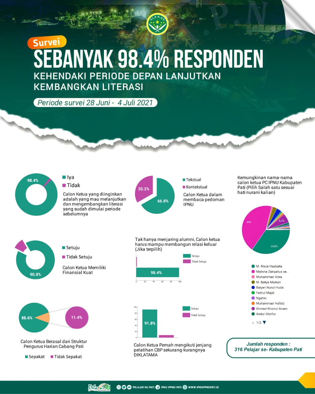 Sementara itu Moh Salman, Ketua PC IPNU Kabupaten Pati setelah melihat survey ini mengatakan bahwa ini membuktikan bahwa kader pelajar NU Pati telah merasakan betapa pentingnya pengembangan isu literasi di kalangan pelajar.
