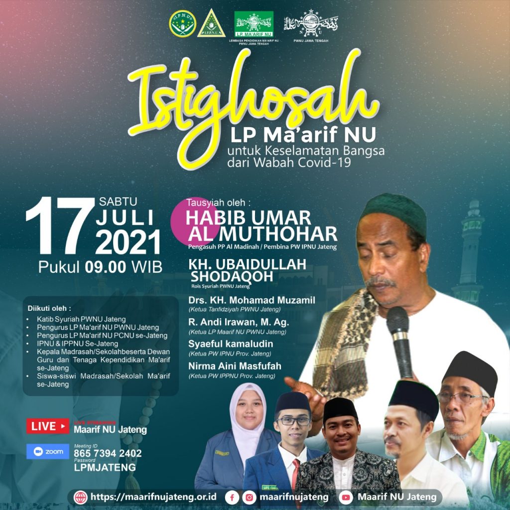 Semarang – Dalam rangka berikhtiar memohon keselamatan bangsa dari wabah covid-19, Lembaga Pendidikan Ma’arif NU PWNU Jawa Tengah menggelar istighosah secara virtual, Sabtu (17/7/2021). Kegiatan yang dirangkai dalam bentuk Istighosah LP Ma’arif NU untuk Keselamatan Bangsa dari Wabah Covid-19 ini diikuti ratusan peserta dari unsur pengurus Ma’arif, Kepala Madrasah dan Sekolah, siswa dan siswi Ma’arif NU, dan kader IPNU-IPPNU se Jawa Tengah.