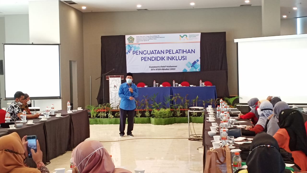 Hal itu terungkap dalam kegiatan Penguatan Pelatihan Pendidik Inklusi di Gammara Hotel Makassar pada hari kedua, Selasa (26/10/2021). Kegiatan ini digelar oleh Subdit Bina Guru dan Tenaga Kependidikan Raudlatul Athfal Direktorat Guru dan Tenaga Kependidikan Madrasah Direktorat Jenderal Pendidikan Islam Kementerian Agama yang diikuti sekirar empat puluh peserta.