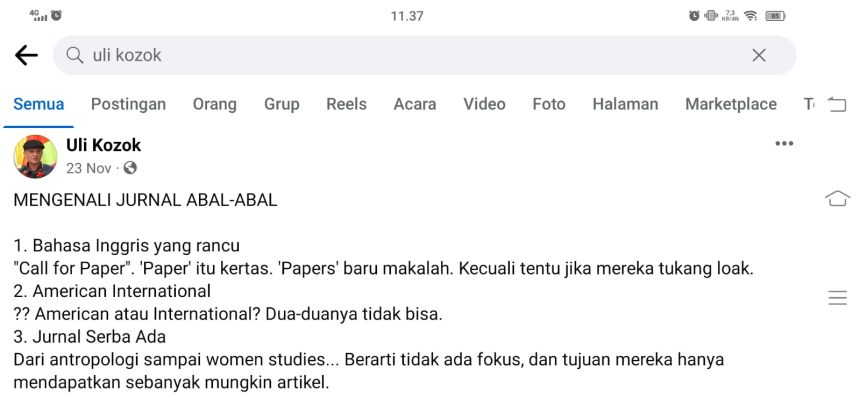 Fenomena Call for Papers abal-abal sebenarnya sudah lama ada dan terjadi sejak saya awal-awal menjadi dosen sekira 2017 lalu. Fenomena itu merupakan situasi di mana jurnal ilmiah atau konferensi menggunakan nama yang tidak terkenal atau tidak kredibel untuk meminta kiriman makalah ilmiah, bahkan jurnalnya palsu. Hal ini seringkali terkait dengan jurnal predator atau jurnal yang kurang terpercaya yang menerima artikel tanpa proses review yang ketat atau tanpa standar akademik yang jelas. Jika Anda ingin mengirimkan karya ilmiah, disarankan untuk mencari jurnal yang terkenal, memiliki reputasi yang baik, dan diakui dalam bidang penelitian Anda.