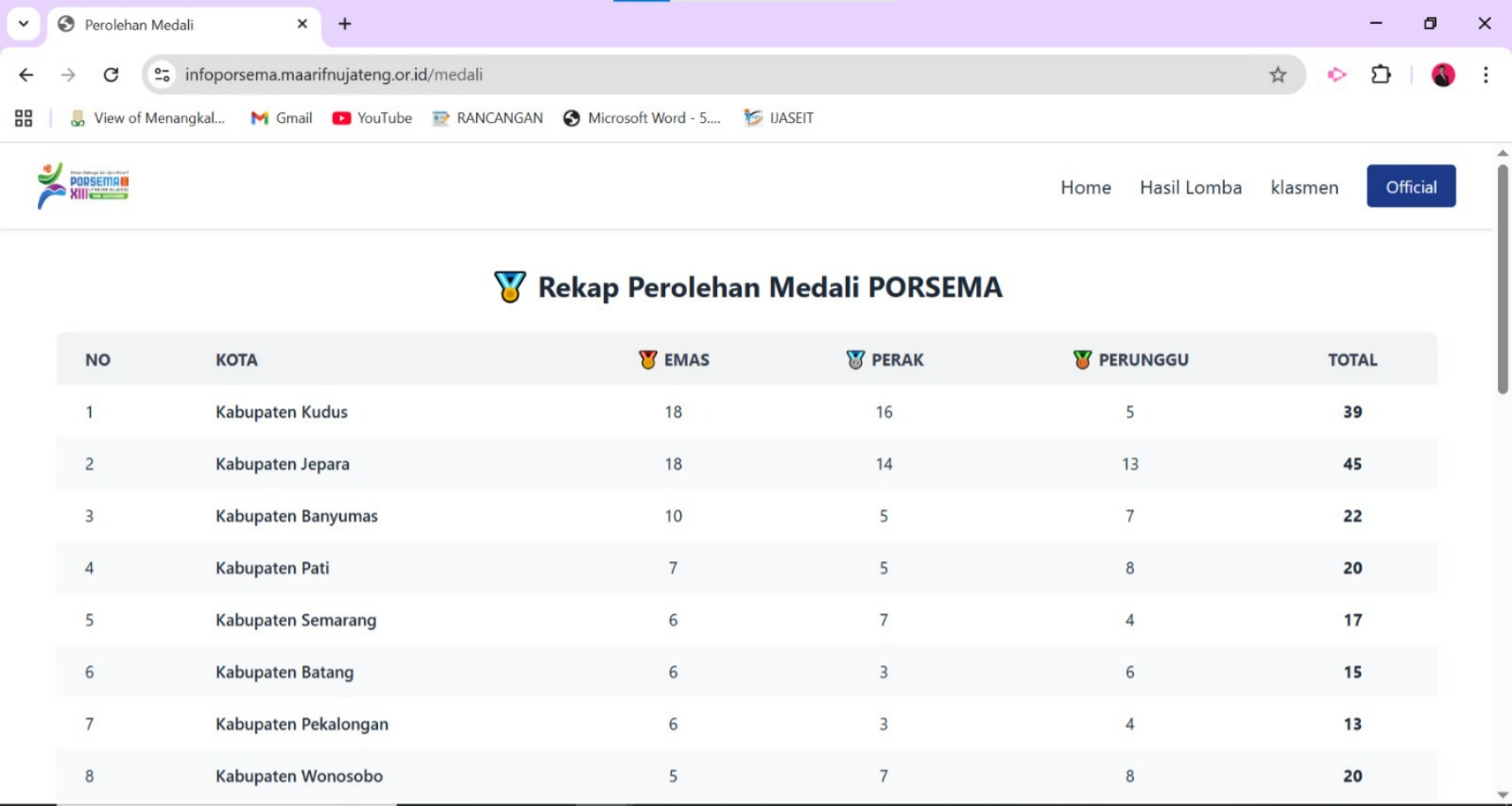 Sementara Kudus mengantongi 39 medali, terdiri dari 18 emas, 16 perak, dan 5 perunggu. Posisi puncak inilah yang menunggu kepastian hingga pengumuman resmi juara umum nanti malam.