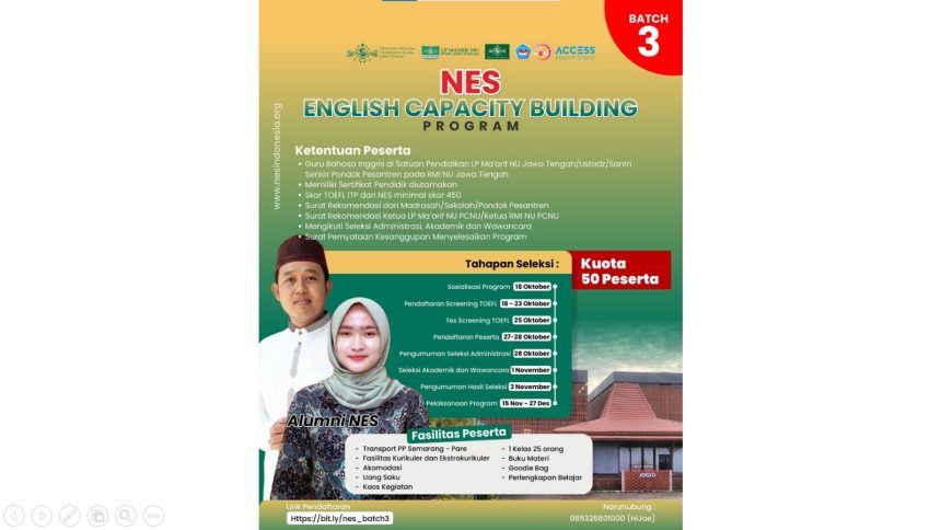 Pendaftaran NES English Capacity Building Program Batch 3 dapat dilakukan melalui tautan https://bit.ly/nes_batch3, dengan narahubung HiJoe di nomor 0853-2680-1000 untuk informasi lebih lanjut. (adm/Ibda)